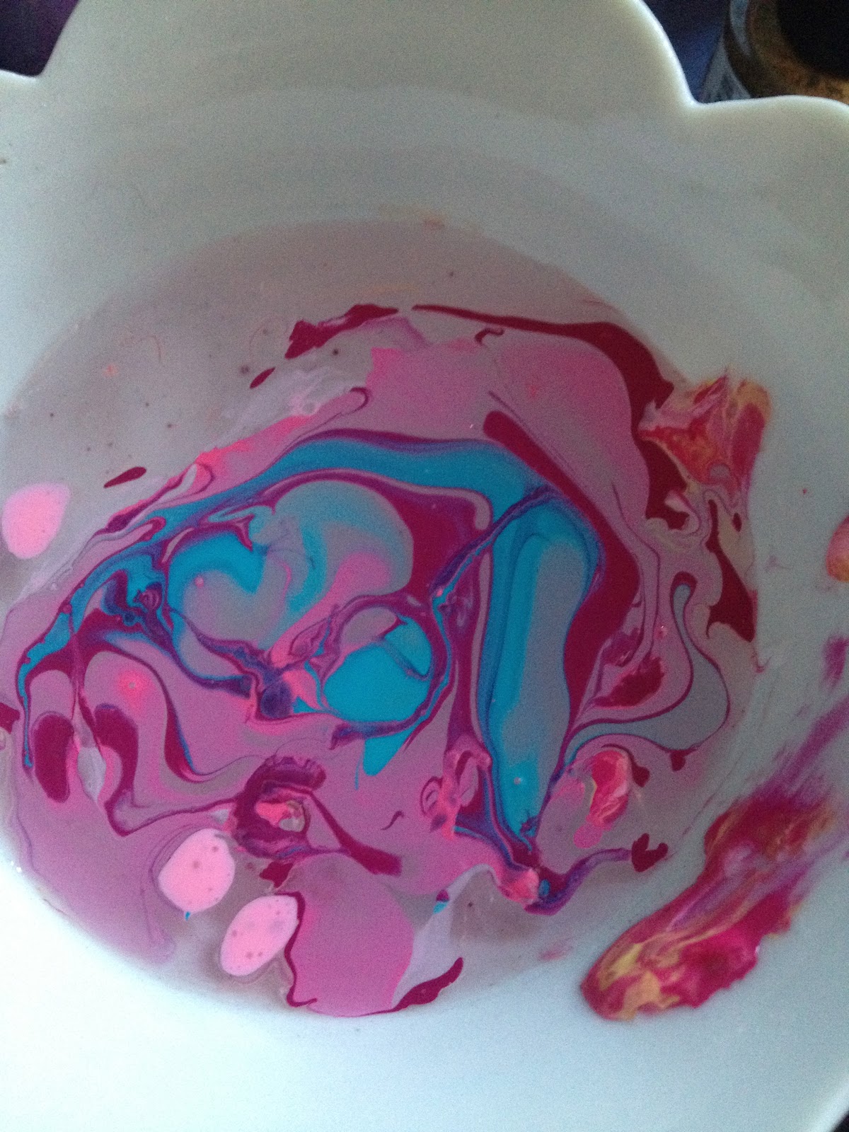 Fill a bowl with a bit of water, and add a drop of your first colour (of nail polish, obviously).